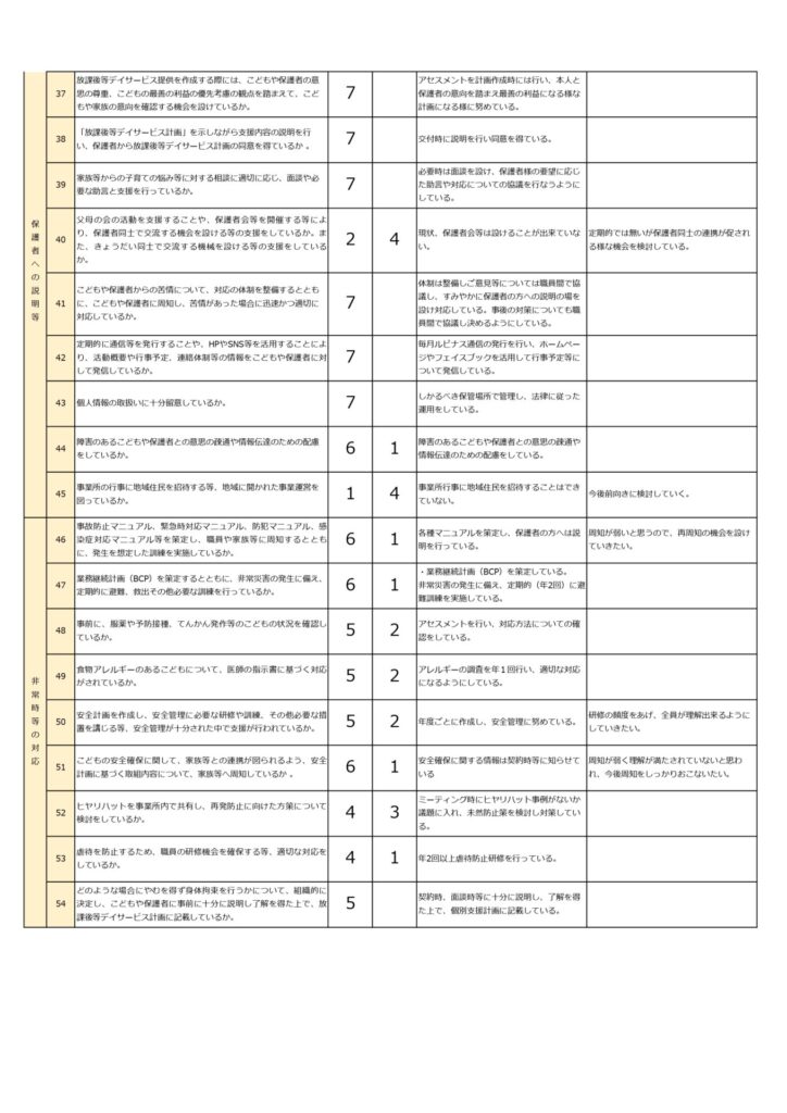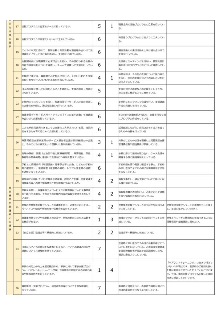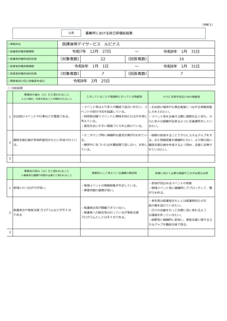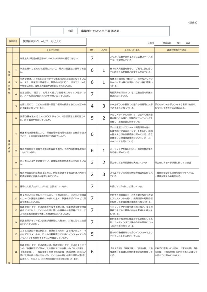 ルピナス中依知 2025年度 放課後デイサービス自己評価表集計結果及び総括 2026年2月26日 最終更新日時 : 2026年2月28日 manager 2025年度の施設職員による評価アンケートの集計結果です。できる限りの改善案を検討し今年度の支援に繋げていきたいと思います。 ご協力ありがとうございました。今後ともよろしくお願い致します。