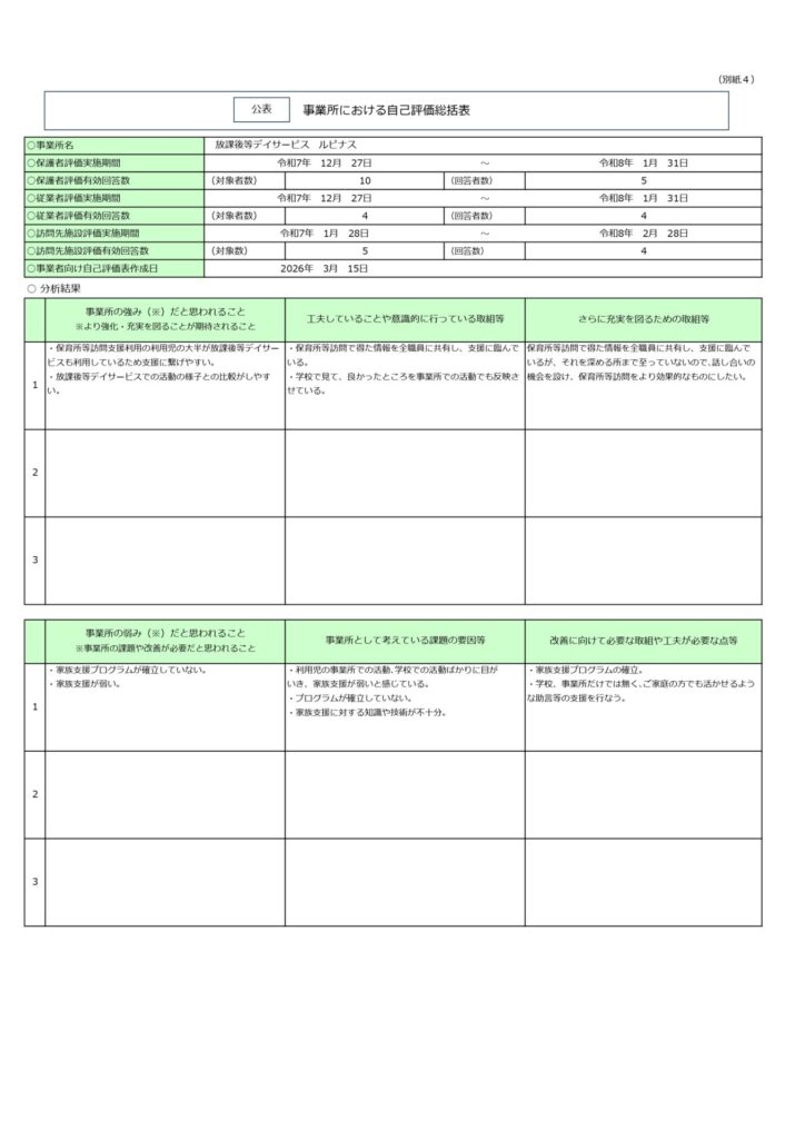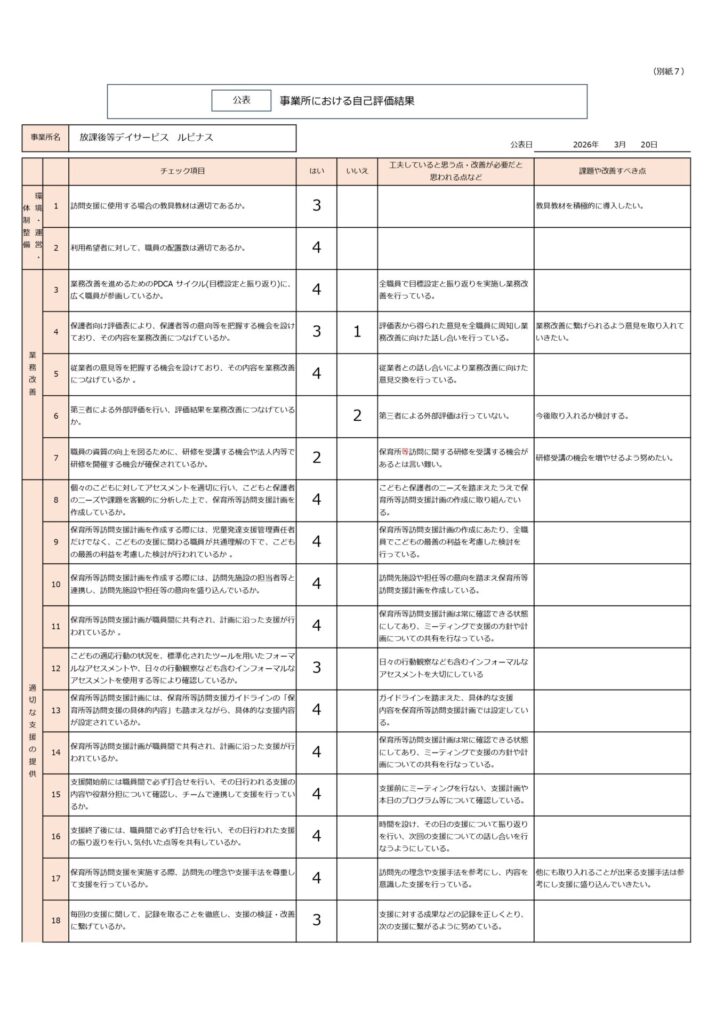 ルピナス中依知 2025年度 保育所等訪問支援自己評価表集計結果及び総括 2026年3月20日 最終更新日時 : 2026年3月19日 manager 2025年度の施設職員による評価アンケートの集計結果です。できる限りの改善案を検討し今年度の支援に繋げていきたいと思います。 ご協力ありがとうございました。今後ともよろしくお願い致します。